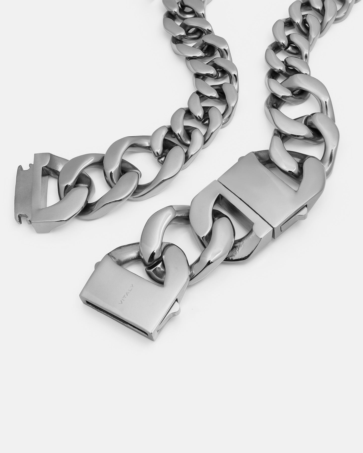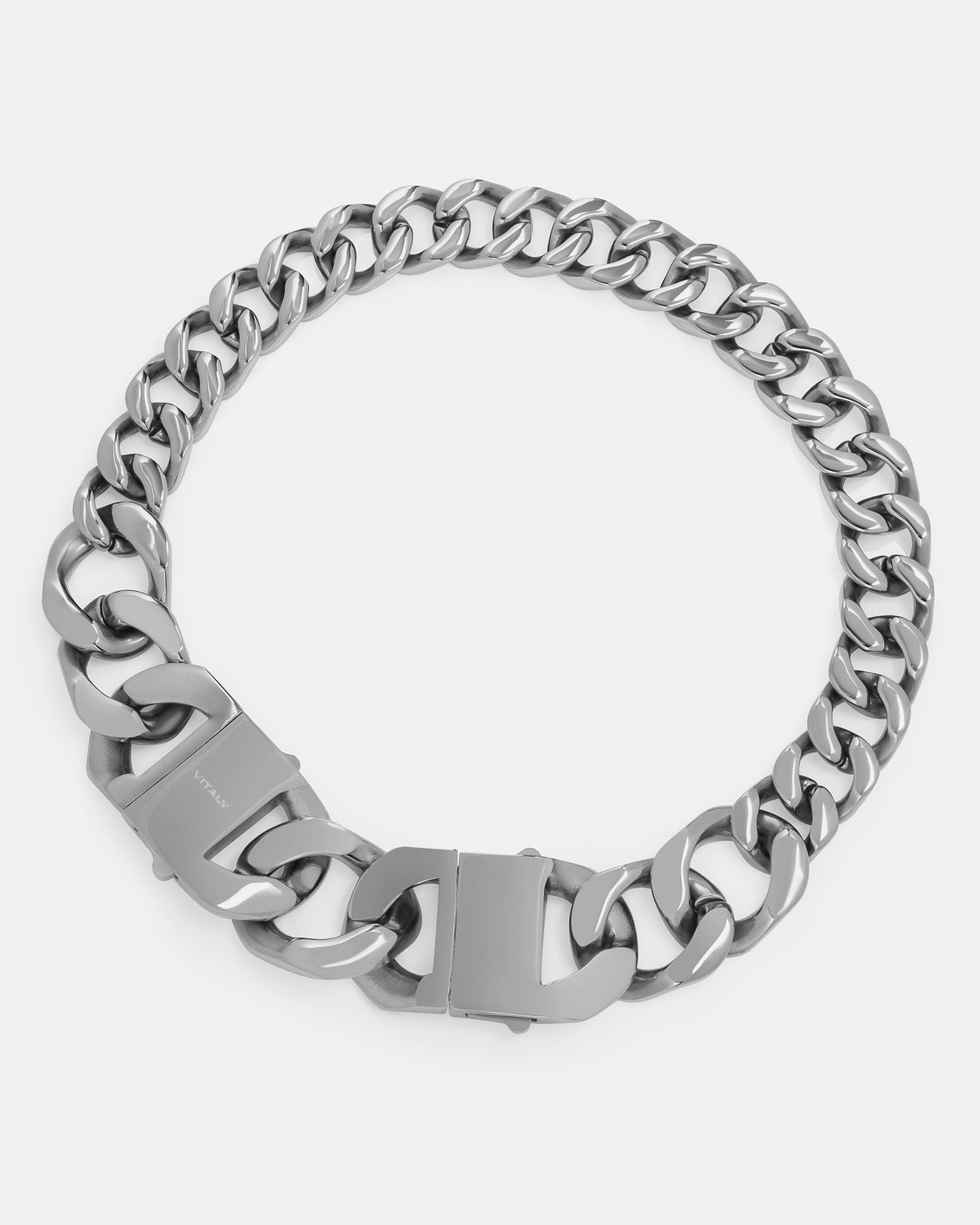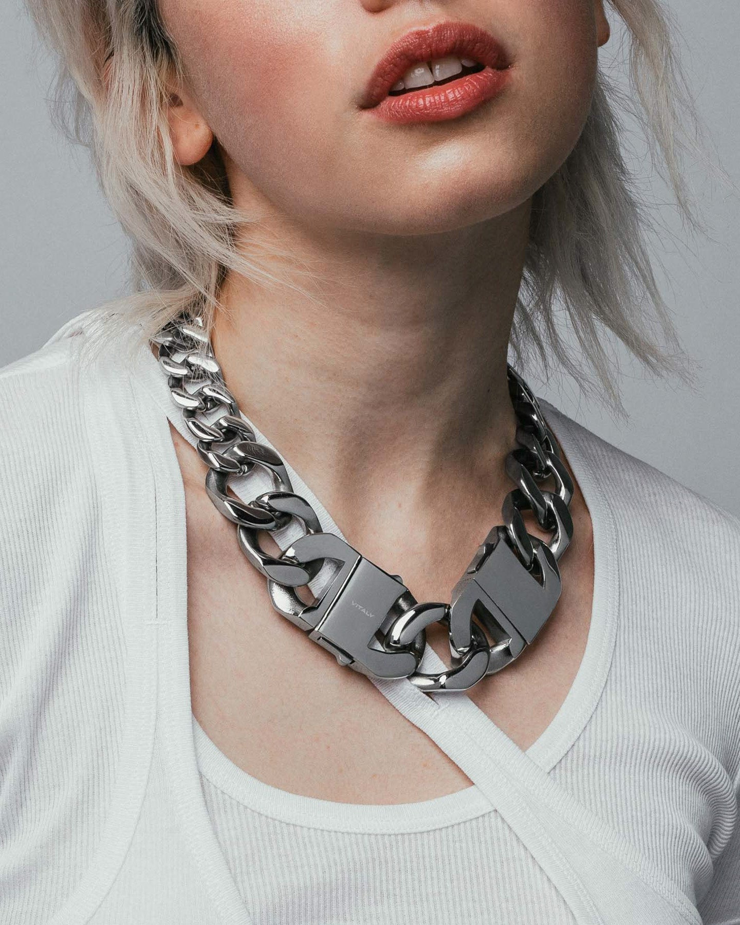 The Fuse is an oversized choker chain marked by substantial links that increase in size before terminating with two heavy-duty buckle clasps at the chain's front. One clasp can be removed to create a tighter fit.