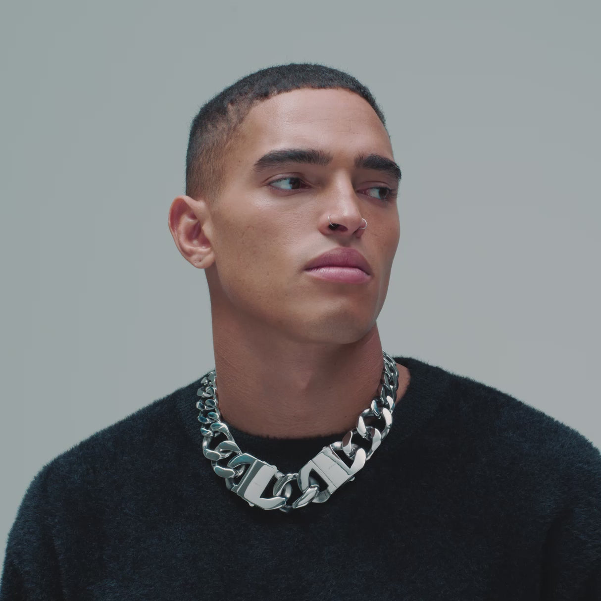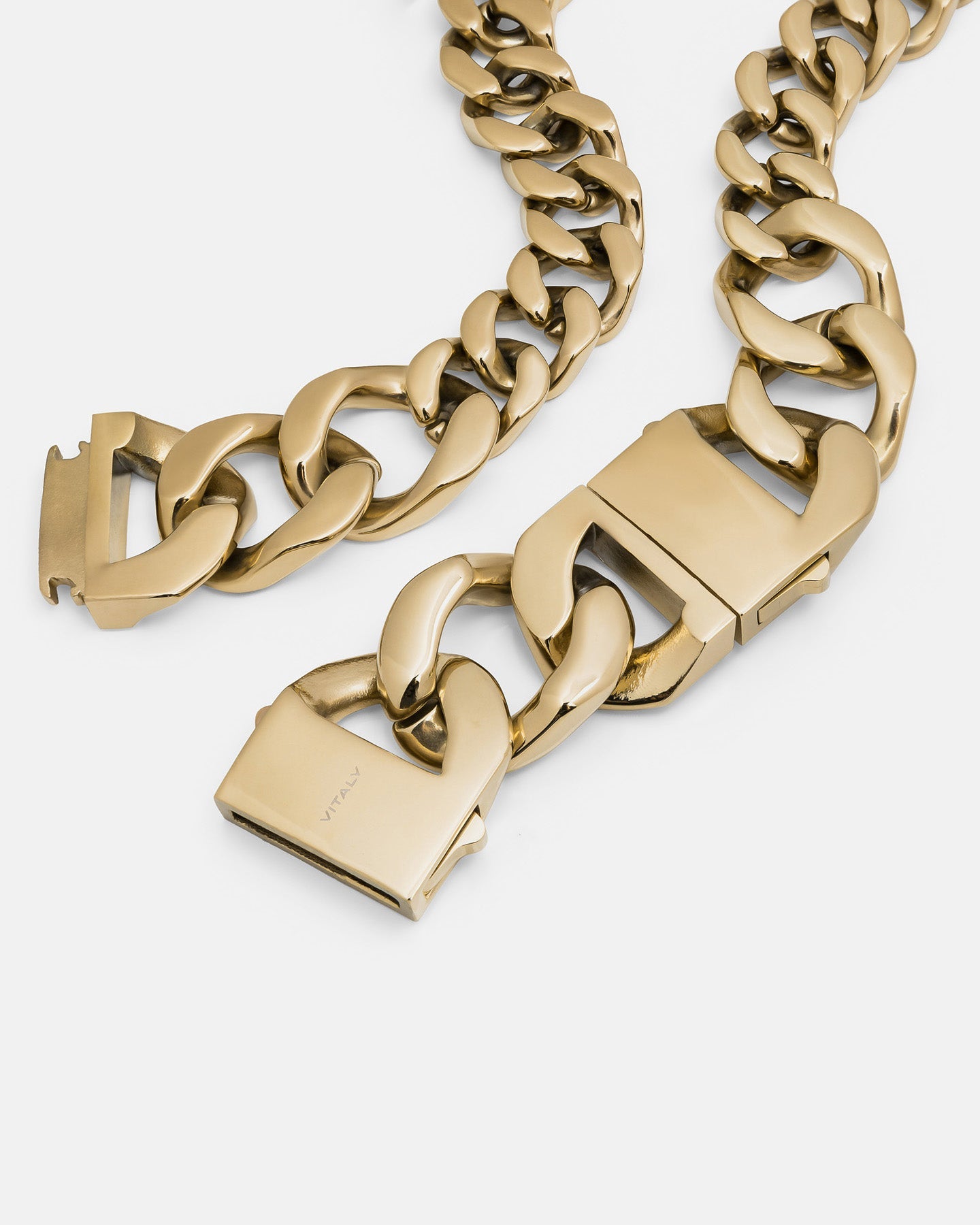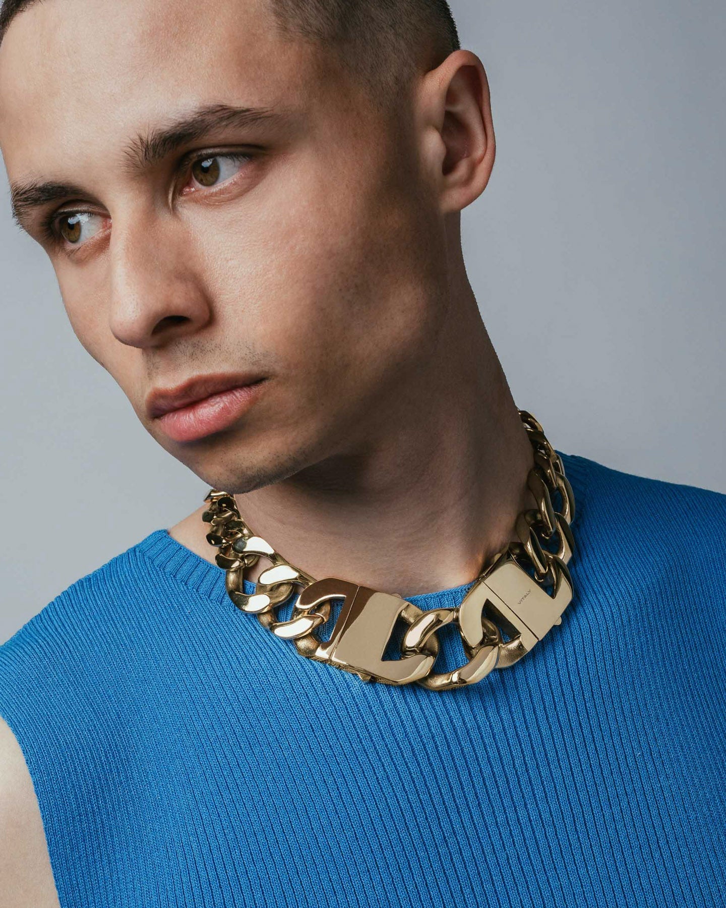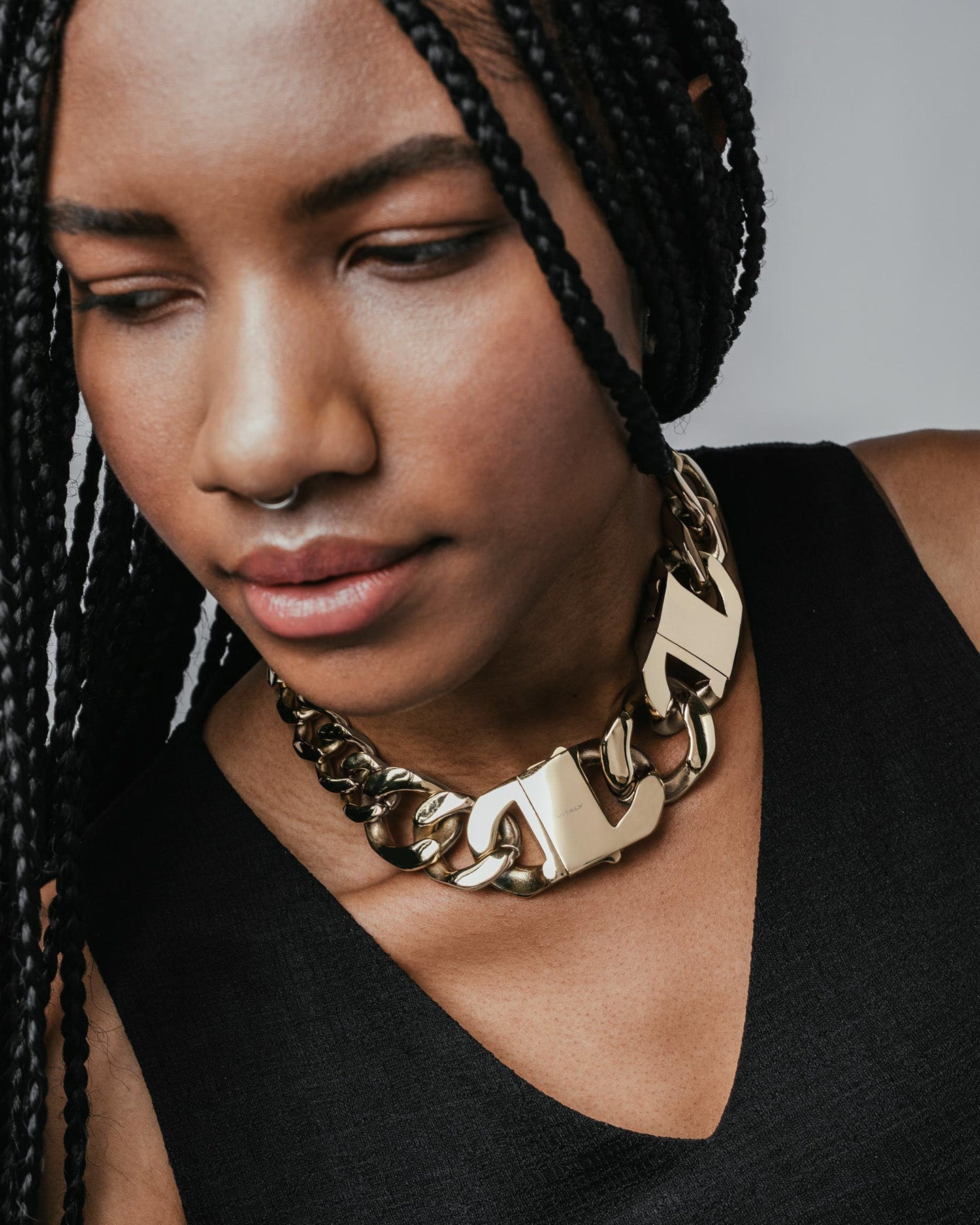 The Fuse is an oversized choker chain marked by substantial links that increase in size before terminating with two heavy-duty buckle clasps at the chain's front. One clasp can be removed to create a tighter fit.
